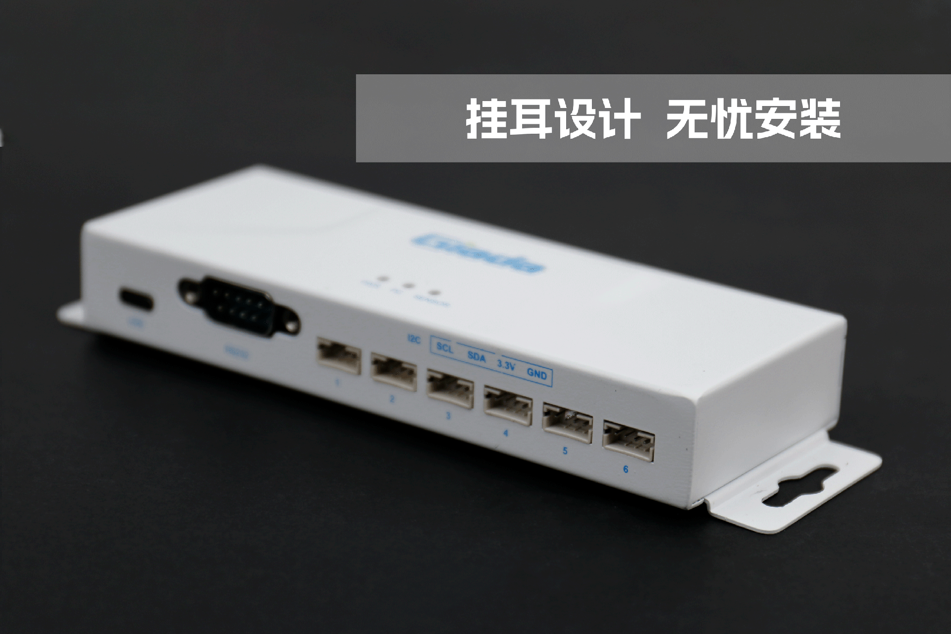 南宫NG·28(中国)相信品牌力量物联网拓展坞RD01外部为白色,顶部印制南宫NG·28(中国)相信品牌力量Giada的彩色logo,外壳采用金属材质,左右两侧设计同材质挂耳,可以方便用户固定设备。